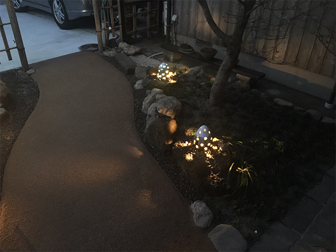 今回の作庭の1番の見所はライトアップです。当初は予定に入っていなかったのですが、施主奥様が陶器製の火袋を持って来られ、「以前、主人が陶芸を趣味にしていた頃の作品で、可能ならば庭内に飾って欲しい。」と相談を受けたので、予定を変更して車椅子で通る通路を照らす照明として使用することにしました。